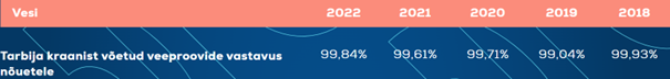 Analüüsitulemused. Meie iga-aastane Kantar Emori korraldatud kliendirahulolu-uuring näitab, et ligi 90% klientidest usaldavad kraanivett ja joovad seda hea meelega. Analüüsime kraanivee kvaliteeti regulaarselt proovivõtupunktides üle linna ja kinnitame, et kraanivett on turvaline juua kogu meie teeninduspiirkonnas. Kraanivesi peab vastama nii mikrobioloogilistele kui keemilistele kvaliteedinäitajatele. Analüüsid teostame akrediteeritud laboris ning proovid võtab atesteeritud proovivõtja, et saaksime veenduda tulemuste õigsuses ja joogivee turvalisuses. 2022 a. võtsime meie opereerimispiirkonnast 3086 veeproovi, millest 99,84% vastas kõikidele normidele. Joogivee kvaliteedi, Ülemiste järve ja põhjavee kvaliteedi kohta leiad infot meie kodulehelt.. Samuti on joogivee kvaliteedi andmed nähtavad Terviseameti infosüsteemis.
