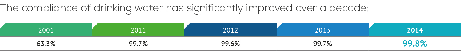 The quality of drinking water supplied to our customers in the capital city has been keeping the quality level comparable to Western European countries for several years already. 2014 was not different from the earlier years in terms of quality. Water quality is characterized by its compliance with legal requirements. In 2014, we took 2 496 samples from the consumers’ taps in Tallinn and Saue. So far the best ever result of 99.80% of all the samples being compliant with all the requirements was achieved. Only 6 samples were not compliant with the quality requirements because of the higher iron content. We immediately performed the maintenance works on the water pipeline in the street, and as a result, the repeat samples met all the quality requirements. In the service area of Maardu, 100% of samples taken from the consumers’ taps were compliant with all the requirements.